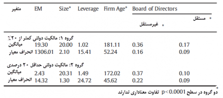 ميانگين اندازه، سابقه بنگاه، تعداد هيئت مديره غيرمستقل (كه مقياس آن بر حسب اندازه تغيير مي كند) و تعداد هيئت مديره مستقل (كه مقياس آن بر حسب اندازه تغيير مي كند) در سطح 0.0001>p براي اين دو گروه متفاوت معناداري دارد. مهم ترين نكته تعداد هيئت مديره مستقل (كه مقياس آن بر حسب اندازه تغيير مي كند) است. تعداد هيئت مديره مستقل در مشاهدات مربوط به مالكيت دولتي كمتر از 20% به شكل معناداري بيشتر از مشاهدات مربوط به مالكيت دولتي حداقل 20 درصد است.