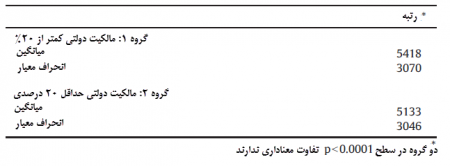میانگین دو گروه در سطح 0.0001>p  تفاوت معناداری دارد به طوری که میانگین گروه 1 (مالکیت دولتی کمتر از 20%) و گروه 2 (مالکیت دولتی حداقل 20 درصدی) به ترتیب برابر با 5418 و 5133 است. بنابراین سطح مدیریت سود در مشاهدات مربوط به گروه مالکیت دولتی کمتر از 20% در مقایسه با مشاهدات مربوط به مالکیت دولتی حداقل 20 درصدی به شکل معناداری بالاتر است.