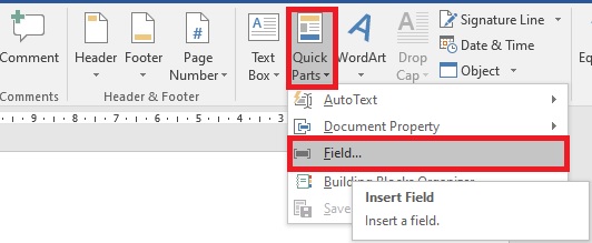 ابتدا از منوی Insert گزینه Quick Parts را انتخاب کرده و سپس گزینه Field را کلیک کنید. مانند تصویر زیر:
