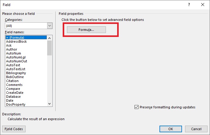چگونه اعداد را با جداکننده هزار در Word تایپ کنیم؟سپس از پنجره باز شده برروی دکمه Formula کلیک کنید. مانند تصویر یر: