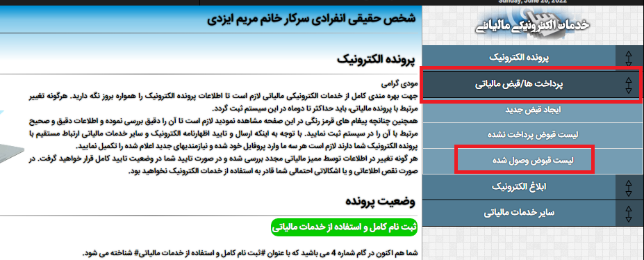 پس از وارد شدن به پنل از سمت راست برروی گزینه پرداخت مالیات کلیک کرده تا گزینه لیست قبوض وصول شده نمایش داده شود