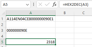 2- مرحله بعدی تبدیل هگزادسیمال به دسیمال است که در اکسل به صورت زیر انجام میدهیم